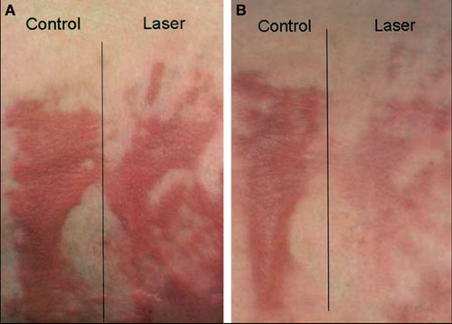 脉冲染料激光(PDL)是用来治疗毛细血管扩张及PWS等血管性疾病的,其原理是通过选择性的光热解原理,选择性破坏微血管。由于早期瘢痕、增生性瘢痕及瘢痕疙瘩往往充血明显,增生性瘢痕的血流率较对照皮肤及成熟瘢痕高2-4倍。因此血管增生在瘢痕增生的发展中起重要作用,增生的程度可能与微血管再生有关,因此PDL有可能用来预防及治疗增生性瘢痕及瘢痕疙瘩,通过破坏增生的血管,可以抑制瘢痕继续增生,并使瘢痕提前进入成熟期。PDL用于增生性瘢痕及瘢痕疙瘩的治疗已有了10余年的历史,获得了明显的效果,临床症状,瘢痕的外观,手感,充血等均能明显改善,厚度减小。