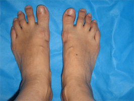 足拇外翻俗称“大脚骨”,是一种好发于女性的常见的足部畸形,多呈对称性。表现的症状为足拇趾斜向外侧,第一跖骨内翻,第一二跖骨间夹角增大,跖拇关节轻度半脱位;第一跖骨头在足内侧形成一骨赘,因长期受鞋帮的摩擦,局部皮肤增厚,严重时红肿发炎形成骨赘拇囊炎肿。足拇外翻既会因足部疼痛影响出行又会影响足部的美观,严重者买不到合适的鞋子。此病不仅与遗传有关,而且与穿鞋不当、高跟鞋站立过久、行走过多等原因有关。自2003年起,我科对足拇外翻患者进行了矫形手术,让患有足拇外翻的女性朋友们重新穿上了漂亮的鞋子,迈开了轻盈的脚步。