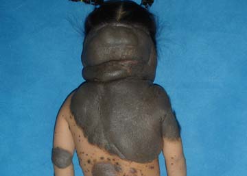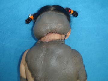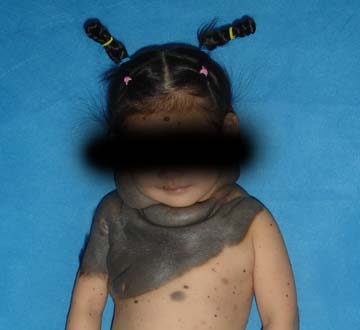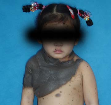 女孩xx,3岁,先天性颈、项部及胸背部大面积黑痣,高出皮肤,臃肿,曾去广州、香港等多家医院求诊,没有结果。慕名来到整形外科医院,滕利主任为其制定了周密的疗计划,决定先实施颈部黑痣切除,改善功能,为保证手术成功,术前组织全科人员及麻醉师进行了会诊,制定了周密的手术计划,手术进行的非常成功,术后恢复良好,滕主任介绍,下一步考虑在头部行扩张器治疗,争取在学龄前将患儿外露部位的黑痣切除,以利患儿健康成长。